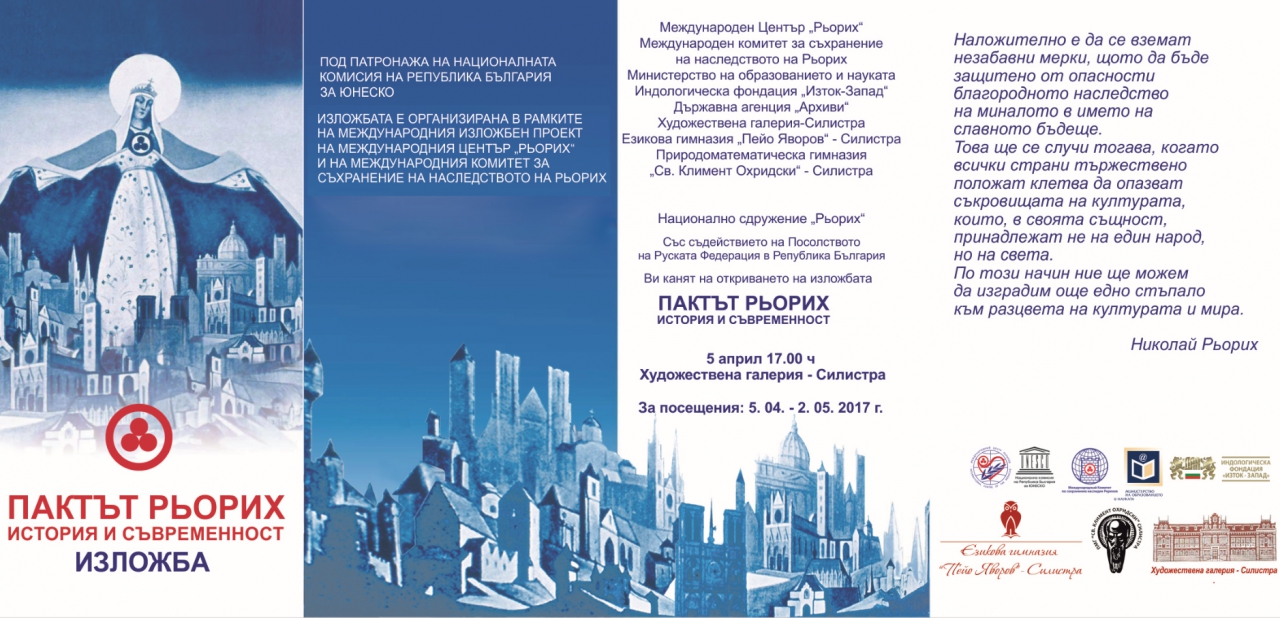 Изложба, посветена на 70 годишнината на ЮНЕСКО, ще бъде открита в Художествената галерия в Силистра. Изложбата е озаглавена -"Пактът Рьорих - история и съвременност" и включва творби на известния руски художник, писател и философ Николай Константинович Рьорих, живял и творил в края на ХІХ и началото на ХХ-ти век. Творбите му са с висока художествена стойност и разнообразни тематики: исторически, религиозни, за родината, за духовното и окултното.