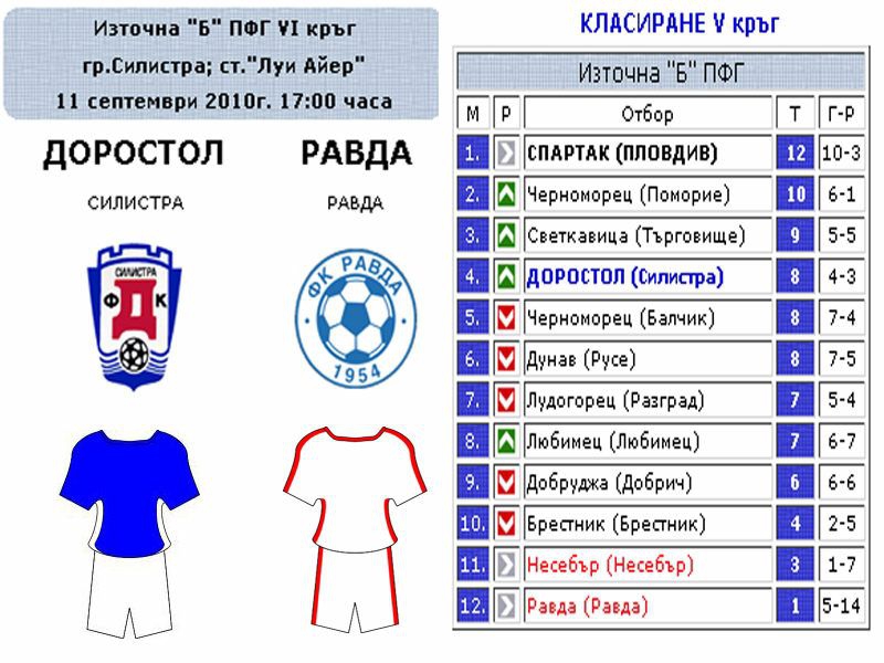 В събота 11 септември от 17:00 часа на родния "Доростол" му предстои двубой от поредния кръг на Източна "Б" ПФГ. Опонент ще е абсолютния аутсайдер - състава на ФК "Равда-1954" Равда. До момента актива на "Доростол" е с 8 точки и се намира на 4 място във временното класиране. Отбора няма проблеми с контузени и наказани футболисти. Клубът от Равда е само с 1 точка и се намира на незавидното последно място в класирането. Съдии на мача ще са Ангел Баялцалиев с помощници Г. Караколев и Г. Георгиев и тримата от София.