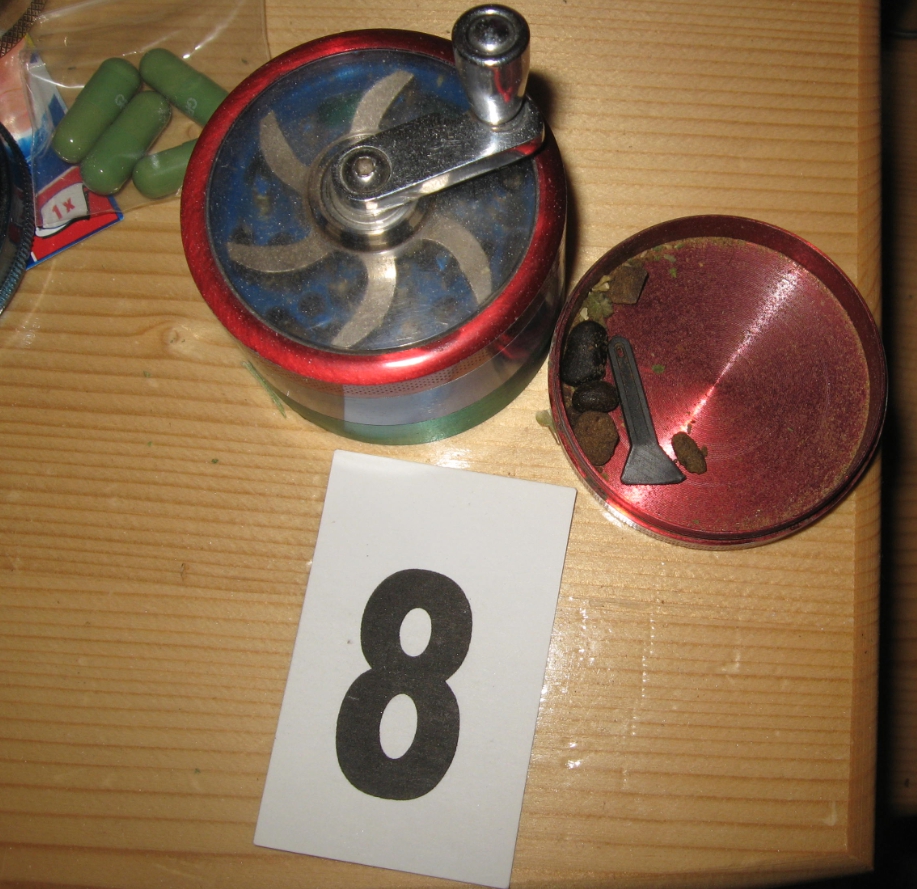 Действайки в условията на неотложност, полицейските служители извършили претърсване на вила и прилежащи помещения в околностите на областния град, обитавани от 30-годишния мъж. В една от пристройките те намерили полиетиленов плик, съдържащ 442,4 г суха листна маса, идентифицирана като канабис с полеви наркотест. Девет таблетки с жълтеникав цвят, реагирали на метамфетамин, около 30 г бяло прахообразно вещество и 4 капсули със зелен цвят, за които са назначени експертизи, били намерени при претърсването на вилната постройка. Пак там криминалистите открили 2 везни и 3 приспособления за разтрошаване на канабис, в едно от които се съдържали топчета хашиш.