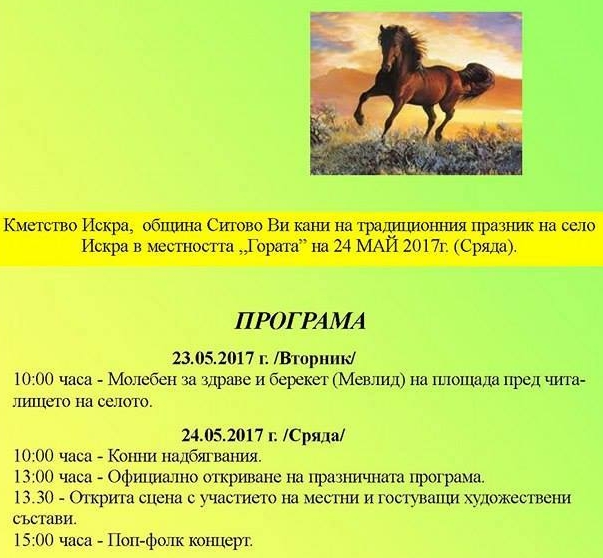 Утре на 24 май най-голямото село на община Ситово - Искра празнува своя празник. Той ще бъде отбелязан с празнична програма и традиционната кушия