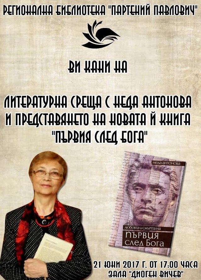 На 21 юни от 17 часа в зала "Диоген Вичев" ще Регионална библиотека "Партений Павлович" Силистра е литературната среща с Неда Антонова, която е единствената жена, носителка на наградата "Златен меч". като представител на издателство "Факел" Румен Леонидов - поет, преводач, журналист, издател и общественик, ще представи авторката на исторически романи, новели и пиеси по повод най-новата й книга "Първия след Бога", посветена на националния герой на България Васил Левски. Предишните книги на гостенката: "Царица Елеонора Българска", "Съвършената Стойна Преподобна" и "Неговата любима" (за Венета и Христо Ботев), се радват на успех сред читателската публика. Част от творчеството й е преведено на руски, френски и чешки езици.