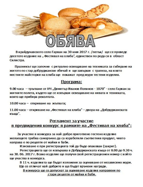 Веднага след ритуала в Етнографския комплекс в Гарван ще се проведе празникът "Фестивал на хляба", на който сръчните домакини от селото ще представят кулинарни тестени шедьоври – пити, баници, торти, сладки и други вкусотии.
