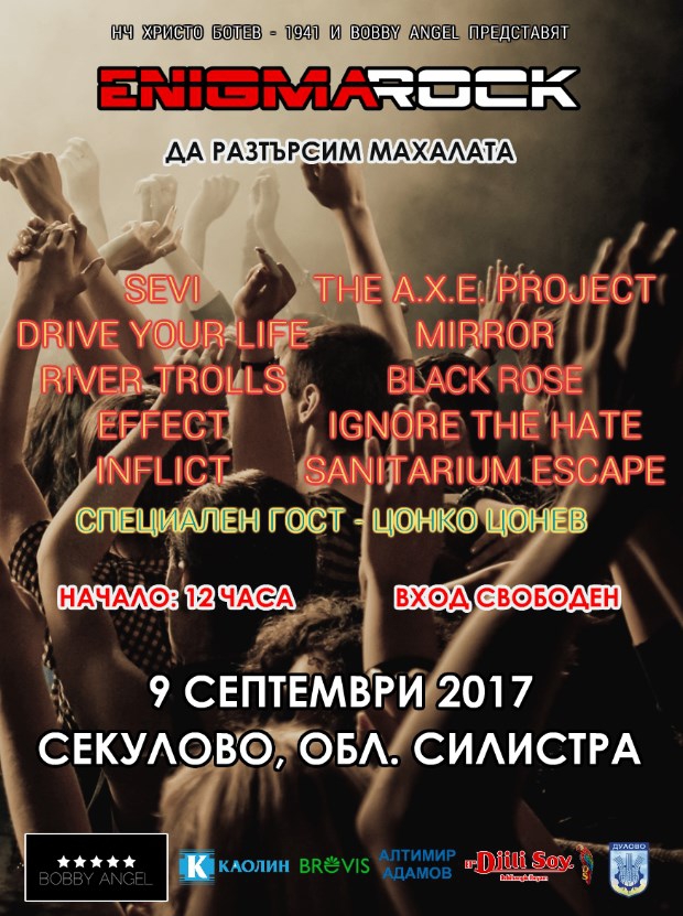 Enigma Rock ще се състои на 9 септември в силистренското село Секулово. Началният час на рок маратона е 12 и ще продължи до полунощ, като на неговата сцена ще стъпят десет от най-добрите съвременни български банди. Вход свободен!