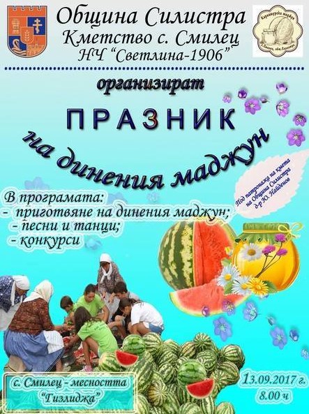 Под патронажа на кмета на Община Силистра, д-р Юлиян Найденов, Община Силистра, Кметство с. Смилец и НЧ" Светлина-1906г." организират и канят всички почитатели на българския фолклор и традиции на Празника на караомурския динен маджун. Събитието се реализира на 13 септември 2017 година в местността " Гизлиджа". Всички фолклорни формации и читалищни самодейци могат да подадат заявление за участие, което ще намерите на сайта на Община Силистра, www.silsitrа.bg
