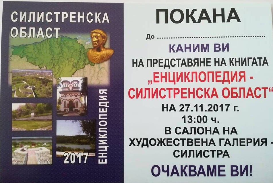 "Енциклопедия -Силистренска област" излезе от печат. Книгата ще бъде представена на 27 ноември 2017г. от 13.00ч., в зала 13 на Художествена галерия – Силистра.