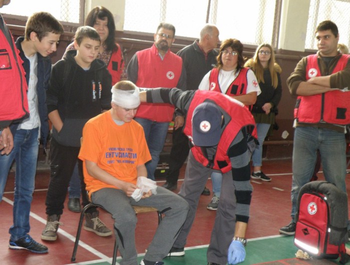 ДЕРБАК към БЧК Силистра, начело с ръководител Тодор Христов, направиха демонстрация на първа долекарска помощ на пострадали участници в пътен инцидент – велосипедист, блъснат от лек автомобил. На учениците бе показано как да извършат преглед на тялото на пострадалия; как да обездвижат счупена тазобедрена става ; как да преведат пострадалия в безопасно странично положение; как да направят превръзка при черепно-мозъчна травма, видове превръзки при прорезни рани, тампониране, сърдечен масаж, дишане уста в уста и др.
