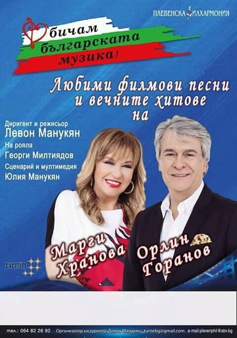 На 15.01. (понеделник) 2018 година от 19 часа в салона на Община Силистра гостуват Плевенската филхармония с диригент Левон Манукян и популярните български изпълнители Маргарита Хранова и Орлин Горанов с концерт от любими филмови песни.