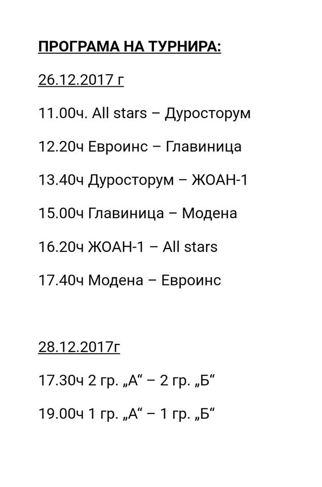 Волейболен турнир в полза на деца сираци от ЕГ "П. Яворов" Силистра, в чиято зала са мачовете, организира местната Аматьорски лига в дните по Коледа, научаваме от Фейсбук: КОЛЕДЕН БЛАГОТВОРИТЕЛЕН ТУРНИР ПО ВОЛЕЙБОЛ- от 11 ч. на 26 декември и на 28 декември - 17,30 - за трето място, 19 ч. финал. Участват: ЖОАН-1, ЕВРОИНС, Главиница, Модена, Дуросторум, All stars.