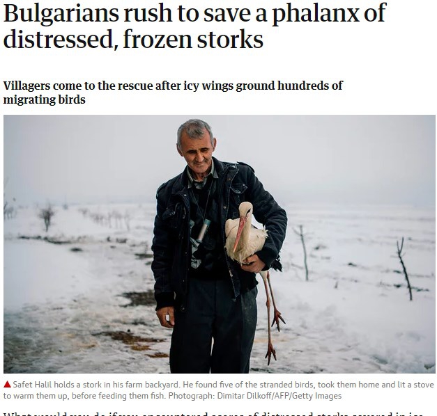 Не сме свикнали често западни медии да хвалят България, за нея се коментира в контекста на на най-бедната и корумпирана държава в ЕС. Сайта на английската медия "The guardian"(www.theguardian.com) информира читателите си за акцията на спасителя на щъркели от - Сафет Халид от село Зарица, Силистренско. Статията е озаглавена - "Българи се втурват да спасяват колония стресирани и измръзнали щъркели".