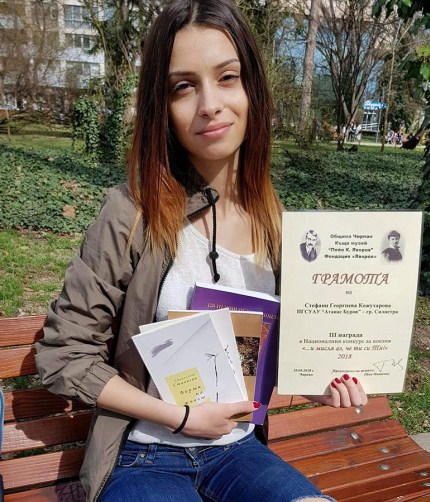 Трето място за поезия – грамота, книги и парична награда получи Стефани Кожухарова от 12 б клас, участвала в конкурса с три стихотворения.