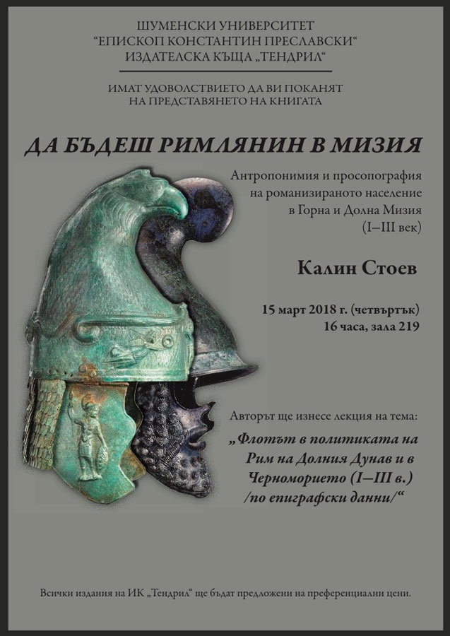 Днес на 19 април (четвъртък) от 17.00 часа в РИМ-Силистра ще бъде представена книгата на Калин Стоев "Да бъдеш римлянин в Мизия. Антропонимия и просопография на романизираното население в Горна и Долна Мизия (I-III век).