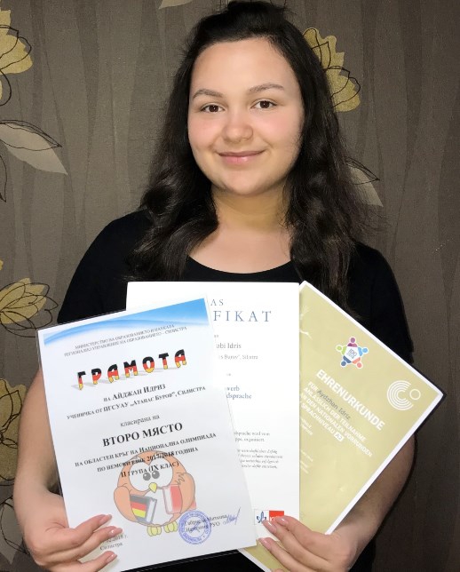 Небивал за гимназията успех постигна деветокласничката Айджан Идриз от Професионална гимназия по стопанско управление, администрация и услуги "Атанас Буров", гр. Силистра. Тя се включи в трите последователни изяви по немски език през месеците февруари и март, в които премери знания и умения в голяма конкуренция с ученици предимно от езикови и други профилирани гимназии в страната.