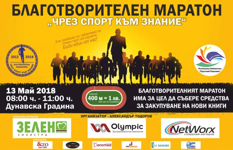 На 13 май /неделя/, в Дунавския парк, за втора поредна година Регионална библиотека "Партений Павлович" и Застрахователна компания "Олимпик" - Генерална агенция Силистра, с подкрепата и партньорството на NetWorx и "Зелен Био" магазин - гр. Силистра, организират Благотворителен маратон "Чрез спорт към знание". Събитието ще се състои от 8.00 до 11.00 часа, на входа на Дунавския парк.