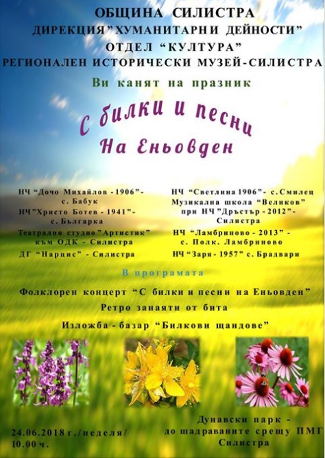 На 24 юни 2018 година /неделя/ Община Силистра, дирекция "Хуманитарни дейности", отдел "Култура" Регионален исторически музей - Силистра организират празник "С билки и песни на Еньовден".