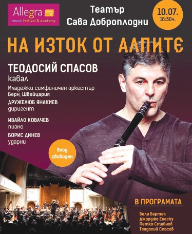 Знаменитият световноизвестен кавалджия Теодосий Спасов, в компанията на младите музиканти от Швейцарския младежки оркестър, ще изпълни произведенията Странен повод, Балада за една надута гайда, Отвъд границата, Отворено настроение.