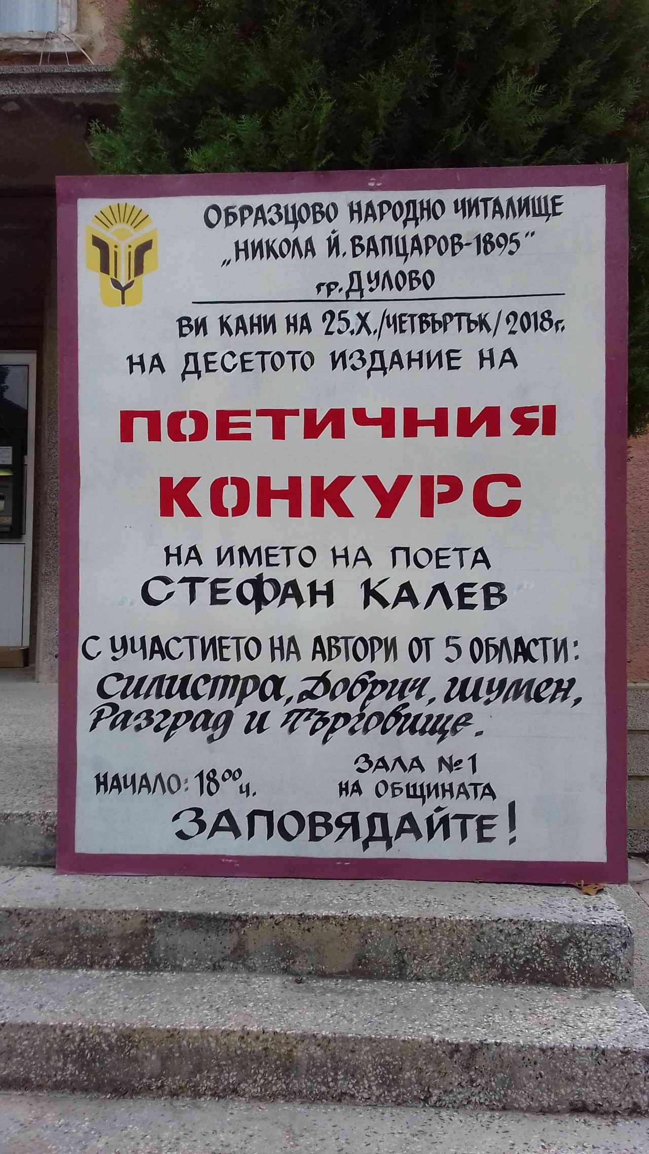 На 25 октомври (четвъртък) поети от Североизточна България ще гостуват в дуловското читалище. Поводът е провеждането на Десетият, юбилеен, литературен конкурс за поезия "Стефан Калев". Домакин на събитието ще бъде Община Дулово, а то ще започне от 18.00ч, в зала №1 в сградата на общината.