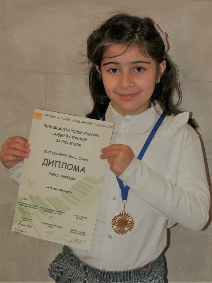 Първокласничката от ОУ "Свети, свети Кирил и Методий" гр. Силистра Ясена Маркова взе участие в V-я Международен конкурс за пиано "Акад. Андрей Стоянов", който се проведе в гр. София от 22 до 25 ноември 2018 година. В групата на най-малките участници тя зае първо място, златен медалист, с изпълнението на "Полка" от Назарова - Метнер, "Снежинки" от Андрей Стоянов и "Шега" от Пенчо Стоянов. Поздравления за нашето "златно" момиче и нейният музикален педагог г-жа Грета Дачева.