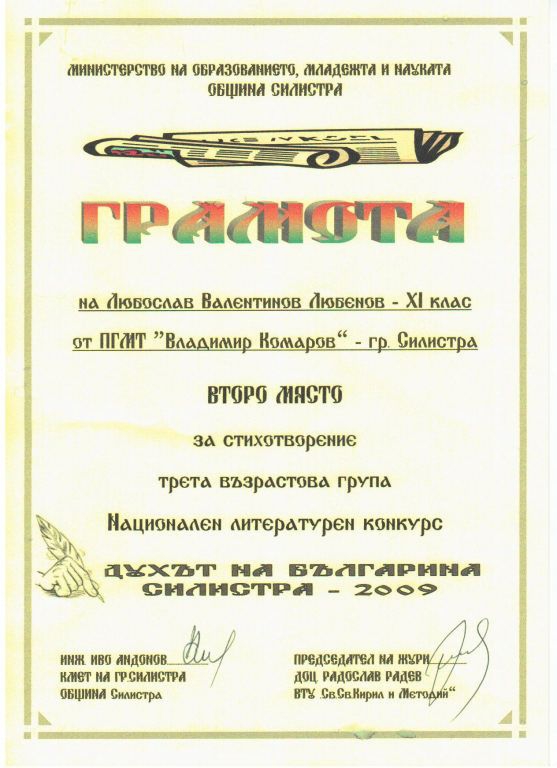За поезия в групата деца от пети до осми клас първа награда бе дадена на Иван Савов от ПМГ "Св. Климент Охридски " в Силистра.