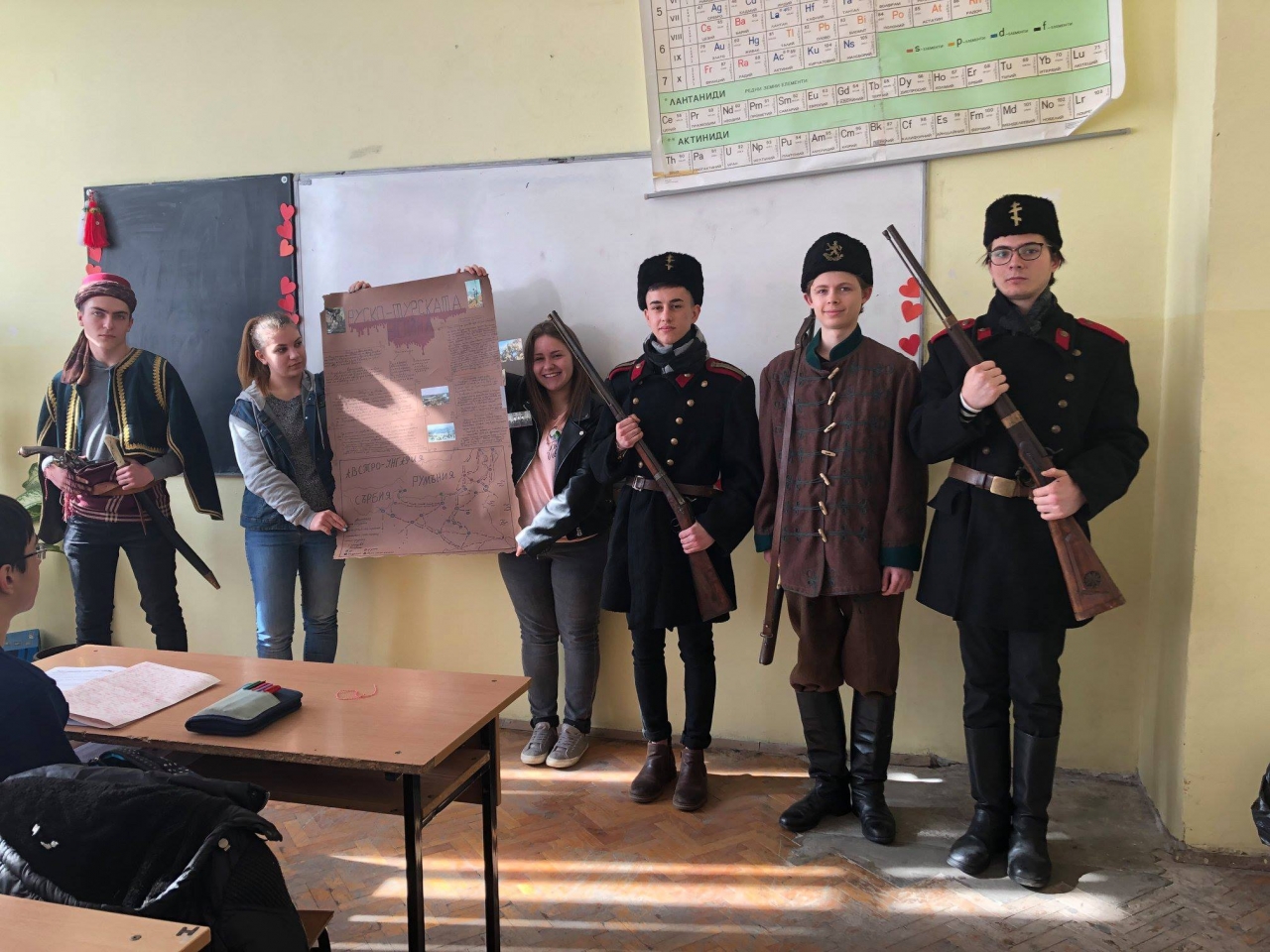 Ученици от 10.в клас от ПМГ "Св. Климент Охридски" намериха нетрадиционен начин да представят историята. В час по история те представиха Руско-турската война, като две от момчетата бяха облечени като руски войници, един като български опълченец и друг като турски войник.