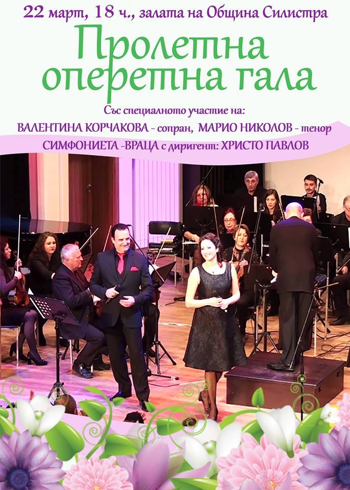 От община Силистра канят всички граждани и гости на град Силистра на празничен концерт по повод Първа пролет. "Пролетна оперетна гала" ще се състои на 22.03.2019 г., в залата на Община Силистра, от 18:00 часа . Програмата включва шедьоври от световната оперетна класика, изпълнени от звездите на музикалния театър – сопраното Валентина Корчакова и тенора Марио Николов, в съпровод на оркестър "Симфониета Враца" с диригент Христо Павлов.