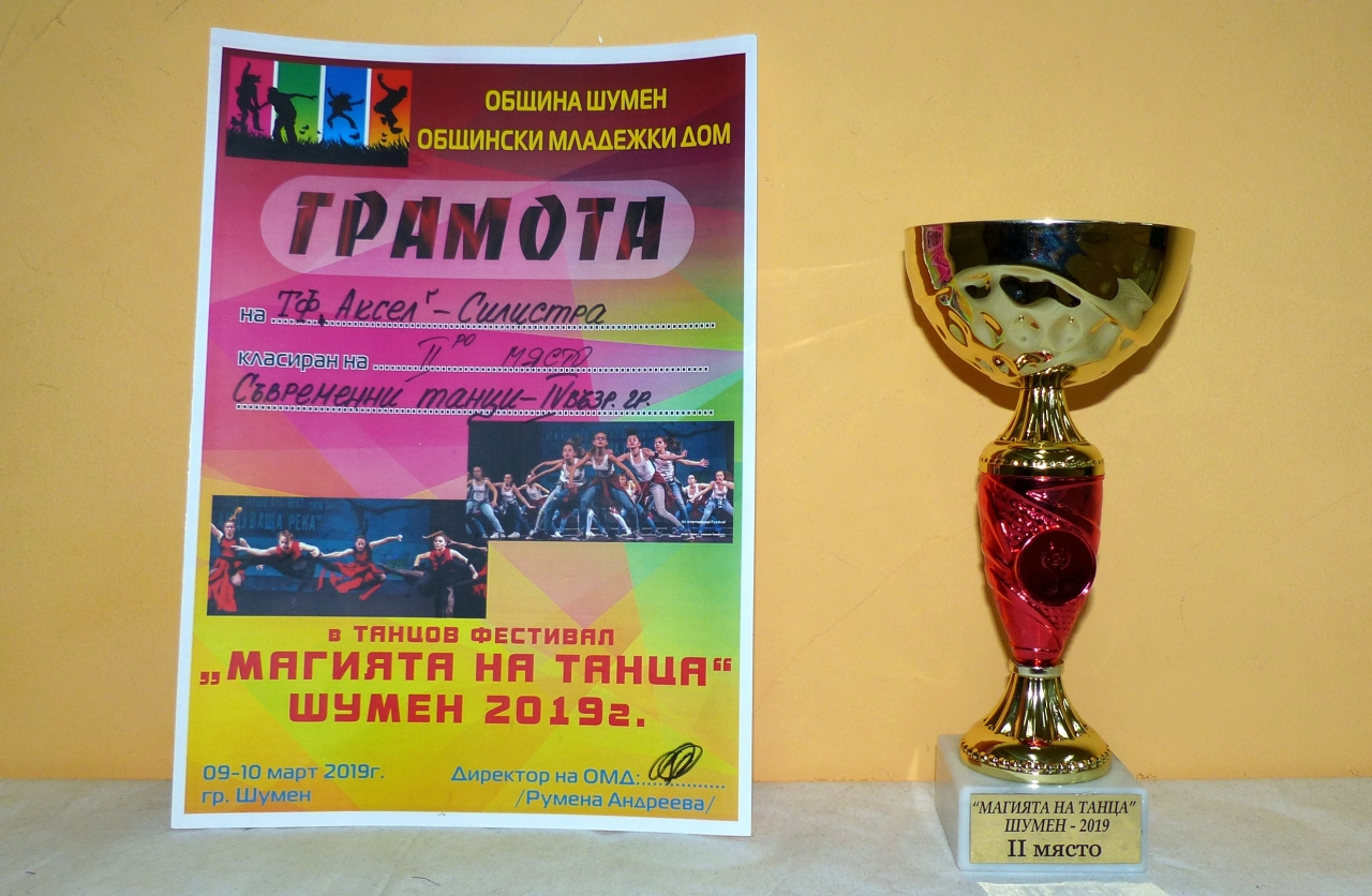 Модерен балет "Аксел" към ОДК - Силистра с хореограф Адриана Мумджиева участва в XIV Национален танцов фестивал "Магията на танца", който се проведе на 9 и 10 март 2019 г. в концертната зала на Общински младежки дом в град Шумен. За отличното си представяне школата беше класирана сред призовите места в конкурса.