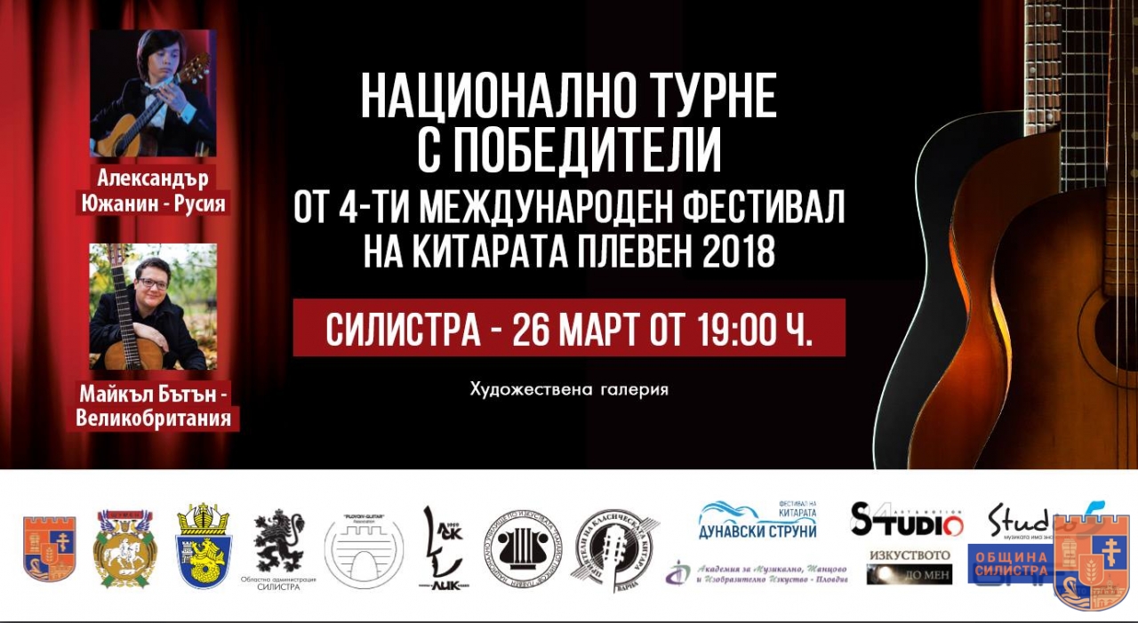 Национално турне с победители от 4-ти международен фестивал на китарата Плевен 2018г. Майкъл Бътън- Великобритания (победител в категория класическа китара, без възрастови ограничения) и Александър Южанин- Русия (победител в трета възрастова група до 19 г.) ще изнесат 7 вълнуващи концерта в страната. Концерта в Силистра е днес 26 март 2019 г. от 19.00 ч. в Художествена галерия.