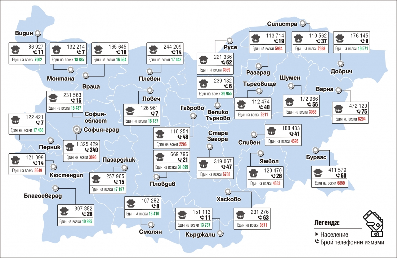 Пословичните с пестеливостта си габровци, но именно те са най-често измамени от "ало измамници". Това става ясно от броя на регистрираните от МВР престъпления в областта за 2018 г. спрямо населението по данни на Националния статистически институт (НСИ) към май м.г. На другия полюс - най-малко жертви на глава от населението, е съседната област Велико Търново, показват данните на МВР. Там само 6 души са дали пари на телефонни измамници през 2018 г. от всички 239 132 - или 1 шаран на 40 000 души. В Търново е и най-голямата разкриваемост на телефонните измами - 70% от случаите, което е рекорд и прецедент за цялата страна. След габровци в класацията по най-много жертви на глава от населението се нарежда област Търговище, където пострадалите са 40 от общо 112 474, или 1 на всеки 2811. Близък е резултатът и в Силистра - 37 жертви от 110 562 население, или 1 на 2988.