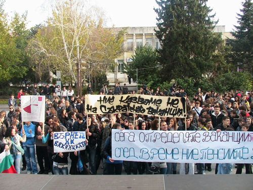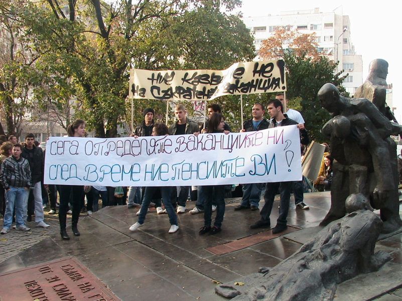 В челната колона на шествието носеха лозунг "Сега вие определяте ваканцията ни, а след време ние – пенсиите ви".
