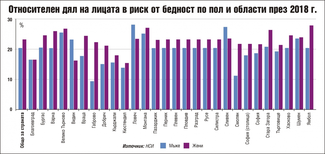 Линията на бедност се изчислява отделно и на регионален принцип в зависимост от разполагаемия общ нетен доход на домакинствата по области. Така най-ниската линия на бедност - 239 лв. на член от домакинството месечно, е в Монтана, а най-високата е в столицата, където беден е всеки с под 513 лв. месечно 12,1%, при 28,0% за област Ямбол. В областите Габрово, Смолян, Русе, Ямбол, Враца, Добрич, Варна и Стара Загора относителният дял на жените, живеещи в риск от бедност, е по-голям с повече от 5 процентни пункта спрямо относителния дял на мъжете. В пет области - Видин, Силистра, Разград, Ловеч и Сливен, относителният дял на бедните мъже е по-голям от този при жените.