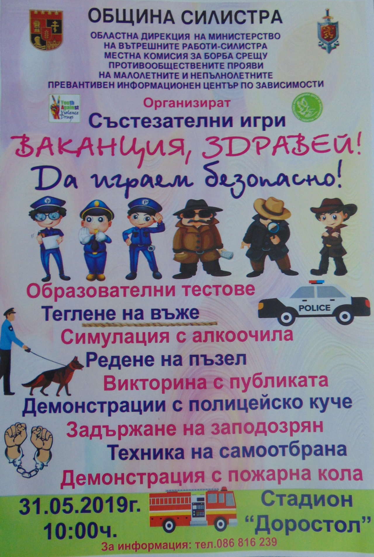 Атрактивно детско състезание под наслов "Ваканция, здравей! Да играем безопасно!" организират Областната дирекция на МВР, Местната комисия за борба срещу противообществените прояви на малолетните и непълнолетните и Превантивно-информационния център по зависимости при община Силистра. То ще се проведе на 31 май от 10.00 часа на стадион "Доростол" в областния град с участието на петокласници от четири училища в областта.