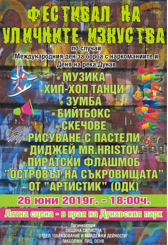 На лятната сцена в Дунавската градина в Силистра ще се проведе фестивал на уличното изкуство. Проявата е посветена на 26 юни - Международен ден за борба със злоупотребата и незаконния трафик на наркотици. Изпълнения на младежки рок банди, на бийтбокс, демонстрации по зумба и хип-хоп танци, рисуване с пастели и пиратски флашмоб, са част от подготвяните прояви в рамките на фестивала, организатори на който са община Силистра, Местната комисия за борба с протиообществените прояви на малолетни и непълнолетни, Превантивният информационен център по зависимости, както и младежи доброволци.