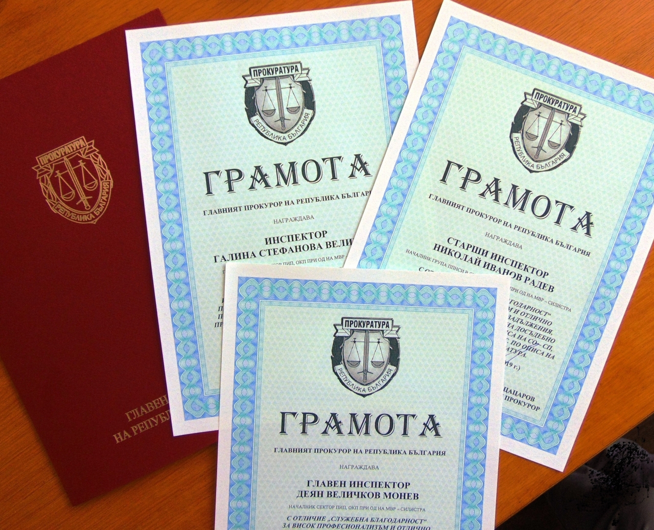 Преди дни в София тримата силистренски полицаи са получили официално грамотите за служебното отличие от административния ръководител на Специализираната прокуратура Димитър Петров, чието е предложението за наградата.