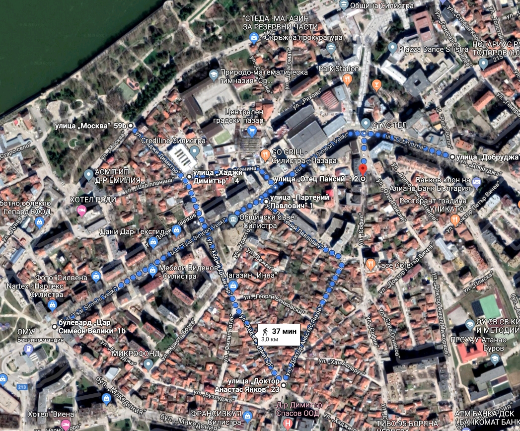 От община Силистра информират, че във връзка с полагането на плътния асфалтобетон на обект: "Достъпна градска среда, чрез реконструкция и рехабилитация на ул. Симеон Велики, ул. Добруджа, гр. Силистра, и Подобект: "Зона за интервенция № 1 : "Реконструкция и рехабилитация на улична мрежа на ул. "Симеон Велики" и прилежащите тротоари и зелени площи"", Ви информираме, че в периода 08.07.2019г./ понеделник/ до 15.07.2019 г. /понеделник/ ще бъдат затворени за движение на МПС следните участъци от улици на централната част в град Силистра: - по ул. "С. Велики" и ул. "Добруджа" - участък от бензиностанция "OMV" до хотел "Danube", като движението ще бъде отбито съответно по ул. "Тутракан" и ул. "Н.Й. Вапцаров" на кръговото кръстовище, както и на кръстовището с ул." Добруджа" и ул. "Петър Берон"; - по ул. "Хаджи Димитър" от двете страни на ул. "С. Велики", като движението ще бъде отбито съответно по ул. "Шар Планина" надясно към ул." Москва" и по ул. "Христо Ботев" наляво към бул. "Македония"; - по ул. "Христо Ботев" – участъка от кръстовището с ул. "Хаджи Димитър" до кръстовището с ул. "Партений Павлович"; - по ул. "Партений Павлович" – участъка от кръстовище с ул. "С. Велики" и ул. "Христо Ботев" до кръстовище с ул. "Анастас Янков"; - по ул. "Шар планина" – участъка от кръстовище с ул. "Хаджи Димитър" до кръстовище с ул. "С. Велики"; - по ул. "София" – участъка от кръстовище с ул. "С. Велики" до "У" образно кръстовище с ул. "Отец Паисий". От понеделник- 8 юли до понеделник- 15 юли 2019 г. по ул."Симеон Велики" ще се полага асфалт.
