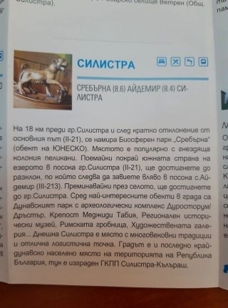 Силистра е представена с биосферен парк "Сребърна", който е под егидата на ЮНЕСКО, с крепостта "Меджиди табия", с Дунавския парк и Стария дъб, Регионалния исторически музей и Римската гробница, Художествената галерия и архитектурно- археологическия комплекс Дорусторум- Дръстър- Силистра.Авторите посочват Силистра като отлична логистична точка за любителите на веломаршрути.