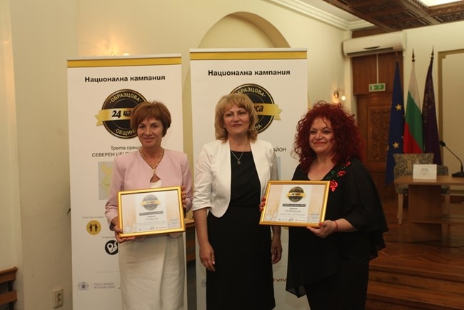 Областната управителка на Велико Търново проф. Любомира Попова даде отличията за добро ниво на образованието на зам.-кметицата на Трявна Николина Николова (вляво) и зам.-кметицата на Тутракан Петя Василева.