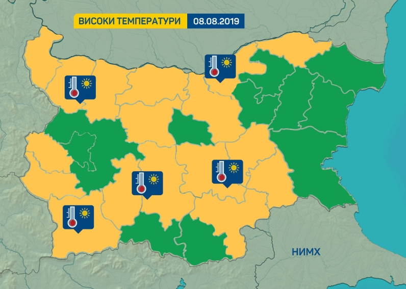 Термометрите ще скочат във Видин, Монтана, Враца, Плевен, Ловеч, Велико Търново, Русе, Силистра, Кюстендил, Благоевград, Пазарджик, Пловдив, Стара Загора, Сливен, Ямбол и Хасково.