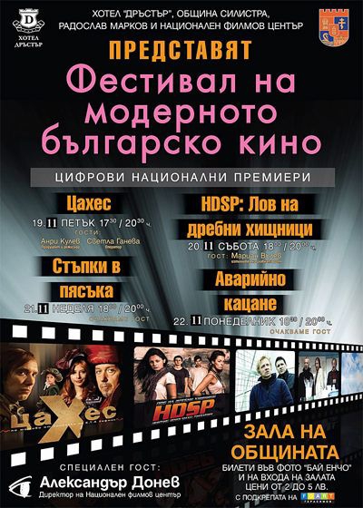 От 19 до 23 ноември в салона на община Силистра ще се завъртят 5 от най-новите български филми: "Цахес" по мотиви от Хофманови приказки, "HDSP: Лов на дребни хищници", "Стъпки в пясъка", Аварийно кацане" и "Хъшове" – част от който е сниман в Силистра, информираха от общината .