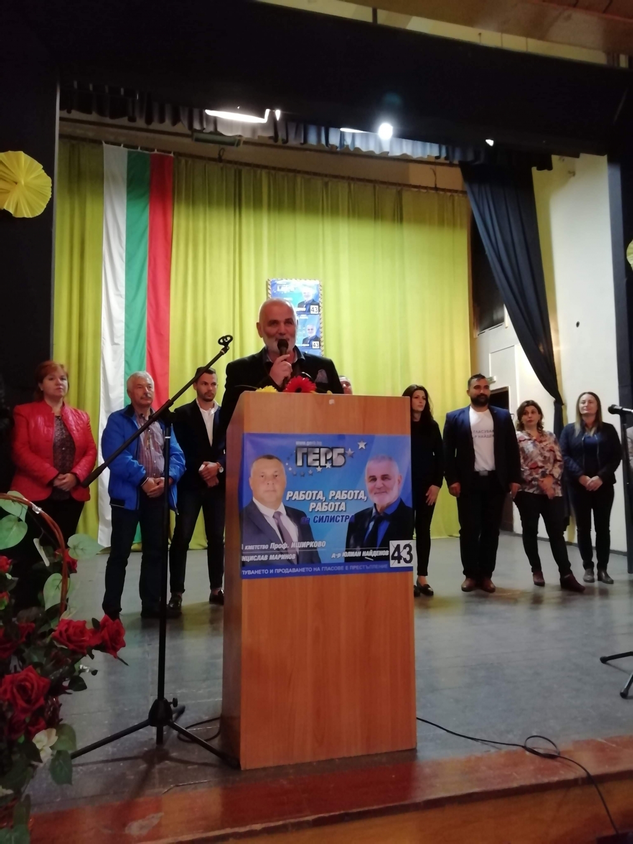 Тази вечер д-р Юлиян Найденов – кандидат за кмет на община Силистра и кандидатите за общински съветници от листата на ПП ГЕРБ, проведоха срещи в селата Ценович и Професор Иширково. Д-р Найденов отчете постигнатото през изминалите два мандата и постави за цел, ако получи доверието на избирателите да продължи с подобряването на всички населени места в община Силистра. В Професор Иширково беше представен и кандидата за кмет на кметство Професор Иширково Венцислав Маринов. Той благодари на всички присъстващи и призова на 27 октомври да гласуват с номер 43 в интегралната бюлетина, за да започнат да се решават проблемите на живущите в селото. Подарък за всички в залата беше музикална програма от ПП ГЕРБ, в която участваха Музикална школа "Великов", танцов състват при Народно читалище "Дръстър-2012", гайдарски състав "Чавдарчета" и пенсионерски клуб №1 – Проф. Иширково.