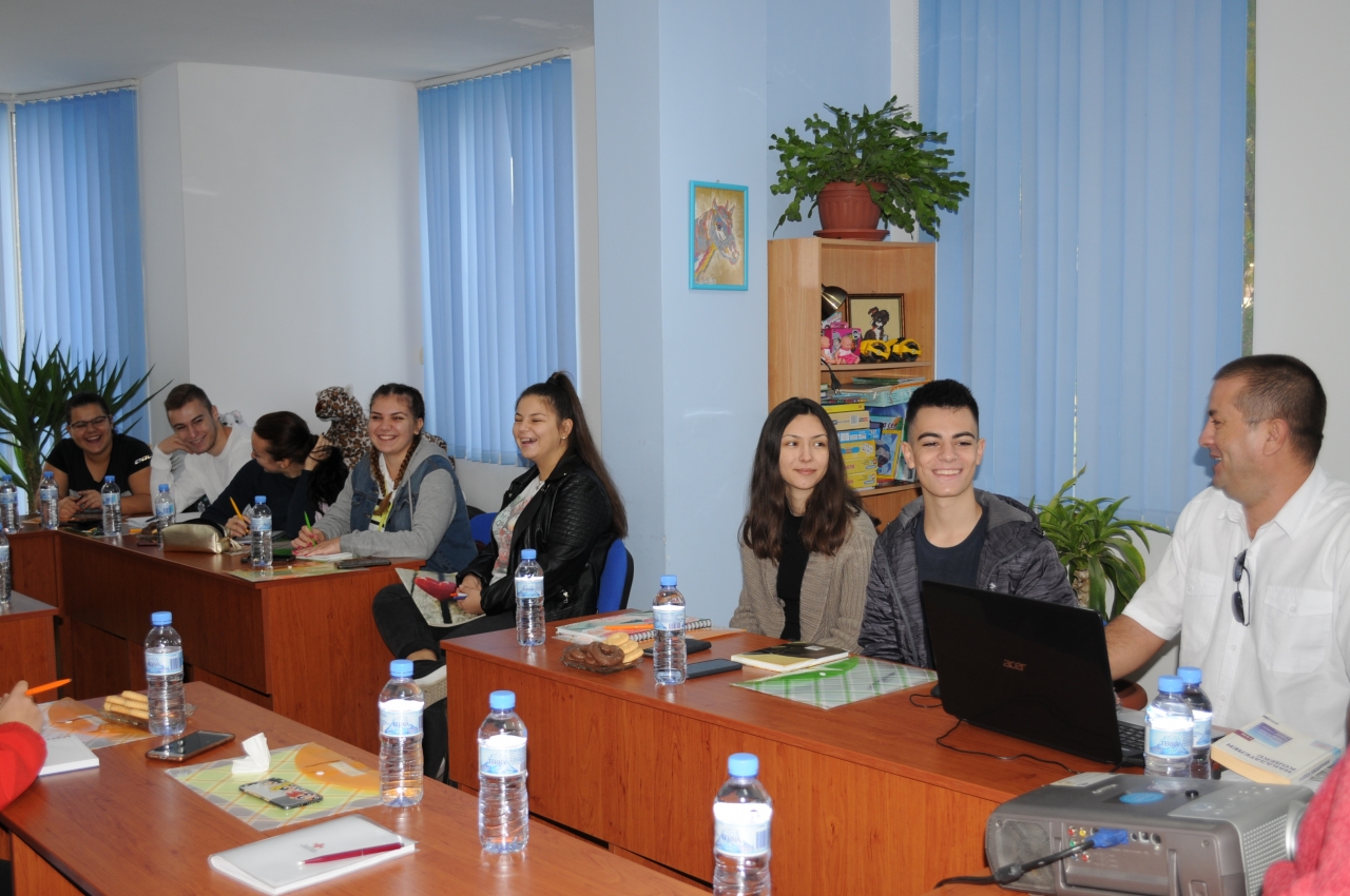 Инспектор Калоян Маринов от сектор "Противодействие на криминалната престъпност" при ОДМВР-Силистра беседва днес с ученици от Природо-математическата гимназия в областния град по темата "Трафик на хора". Срещата се проведе с любезното домакинство на Центъра за обществена подкрепа, чийто експерти също се включиха в дискусията.