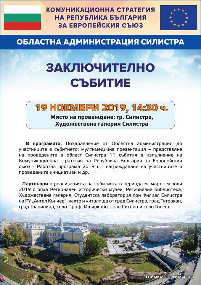На 19 ноември от 14,30 ч. в Художествена галерия Силистра Областна администрация Силистра провежда "Заключително събитие" от работната програма на Министерски съвет на Република България за 2019 г. С мултимедийна презентация ще бъдат представени проведените в област Силистра 11 събития в изпълнение на Комуникационна стратегия на Република България за Европейския съюз. Предвидено е награждаване на участниците в проведените инициативи. Партньори в реализацията на събитията в периода м. март - м. юли 2019 г. бяха Регионален исторически музей, Регионална библиотека, Художествена галерия, Студентска лаборатория при Филиал Силистра на РУ "Ангел Кънчев", както и читалища от град Силистра, град Тутракан, град Главиница, село Проф. Иширково, село Ситово и село Голеш. За втора поредна година в различни общини Областна администрация реализира програма по един от приоритетите в Комуникационната стратегия. Както е известно, миналата година в първите шест месеца България бе председател на Съвет на ЕС.