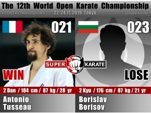 И двамата спортисти проведоха своите боеве днес, през втория ден на първенството. Пред близо 8 000 души в залата първи на татамито излезе възпитаника на сенсей Зихни Хасанов - Борислав Борисов, който се би с французина Антонио Тиссу- шампион на Франция, двукратен европейски шампион и тазгодишен победител All American Open. За съжаление нашето момче загуби с техниката шита тцуки.