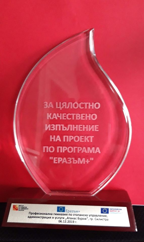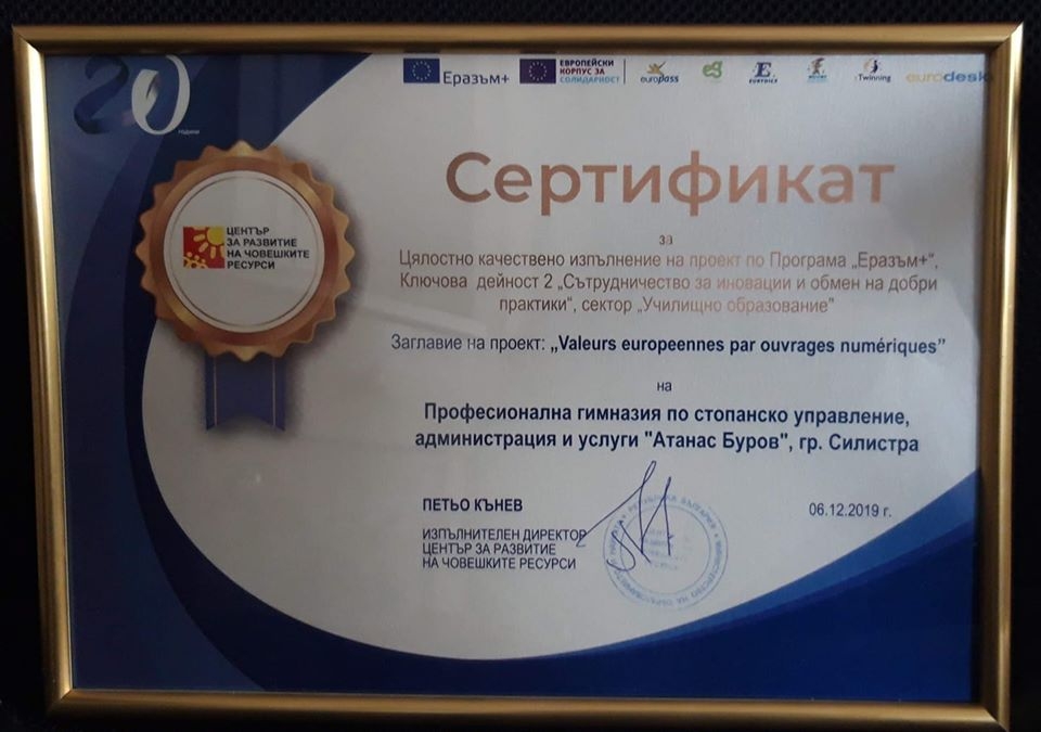 На 6 декември 2019г., Центърът за развитие на човешките ресурси отбеляза 20 години от създаването си с Конференция на тема "20 години Център за развитие на човешките ресурси – "Еразъм+ – Changing lives, Opening minds". На събитието бяха наградени най-успешните проекти и проектът "Valeurs europeennes par ouvrages numériques", чийто координатор е ПГСУАУ "Атанас Буров" е отличен с много висока оценка, а директорът на гимназията, който е администратор на този петстранен проект, е поканен на церемонията по награждаването, която се състоя на 06.12.2019г. в Интер Експо Център, София.Участие в Конференцията взеха Еврокомисарят по иновациите и младежта г-жа Мария Габриел, Министърът на образованието и науката г-н Красимир Вълчев, Министърът на младежта и спорта г-н Красен Кралев, г-жа Янка Такева, Председател на Синдиката на Българските Учители, Изпълнителният директор на ЦРЧР г-н Петьо Кънев и др.