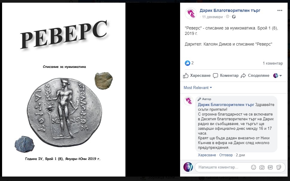Калоян Димов от РИМ Силистра, който отскоро е и докторант, участва със свой принос в търга - пълен компллект от издадените 8 броя на неговото списание за нумизматика "Ревес" (както и двете му книги)