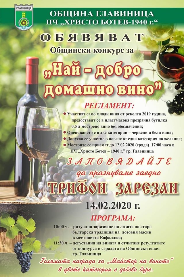 Винопроизводителите от община Главиница са с възможност на представяне на вина в двете категории - червено вино и бяло вино. Мострите - в половинлитрови прозрачни пластмасови бутилки, се приемат до края на работния 12 февруари в читалището в гр.Главиница. Голямата награда "Майстор на виното" и в двете категории е дъбово буре, осигурено от организаторите - Община Главиница и НЧ "Христо Ботев - 1940 г.".