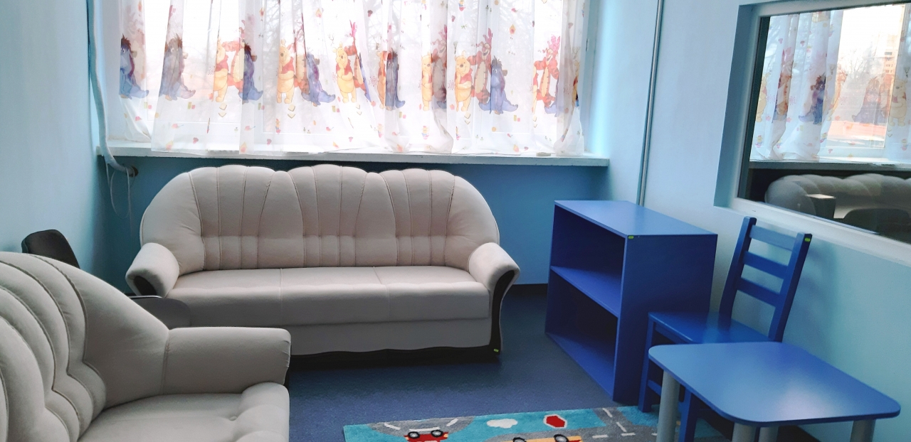 "Синята стая" има две помещения, всяко с отделен вход, свързани с обща стена, част от която е с т.нар. венецианско стъкло, и може да бъде ползвана при разпити по съдебни дела, в досъдебните производства, и от социалните служители в определени случаи.