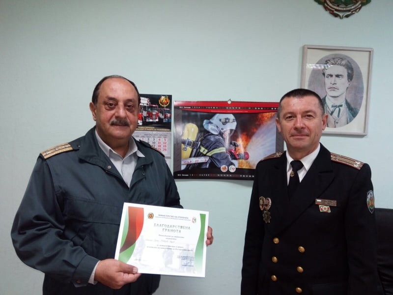 Директорът на пожарната комисар Мъров с грамота от министъра на отбраната