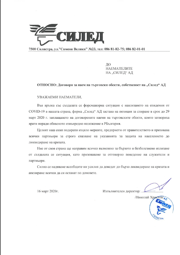С писмо до над 50 наематели на търговски обекти в Силистра фирма "Силед" АД ги уведомява, че до 29 март се спират заплащането на договорените наеми за търговските й обекти.
