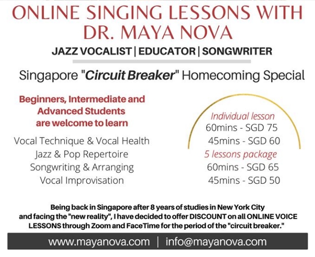 "Връщайки се в Сингапур след 8 години проучвания в Ню Йорк и изправени пред "новата реалност", реших да предложа отстъпка за всички онлайн уроци по глас през Zoom и FaceTime за периода на "прекъснатата верига". Ако решите да се потопите в красивите земи на пеенето и да научите повече за гласа, свържете се с мен!