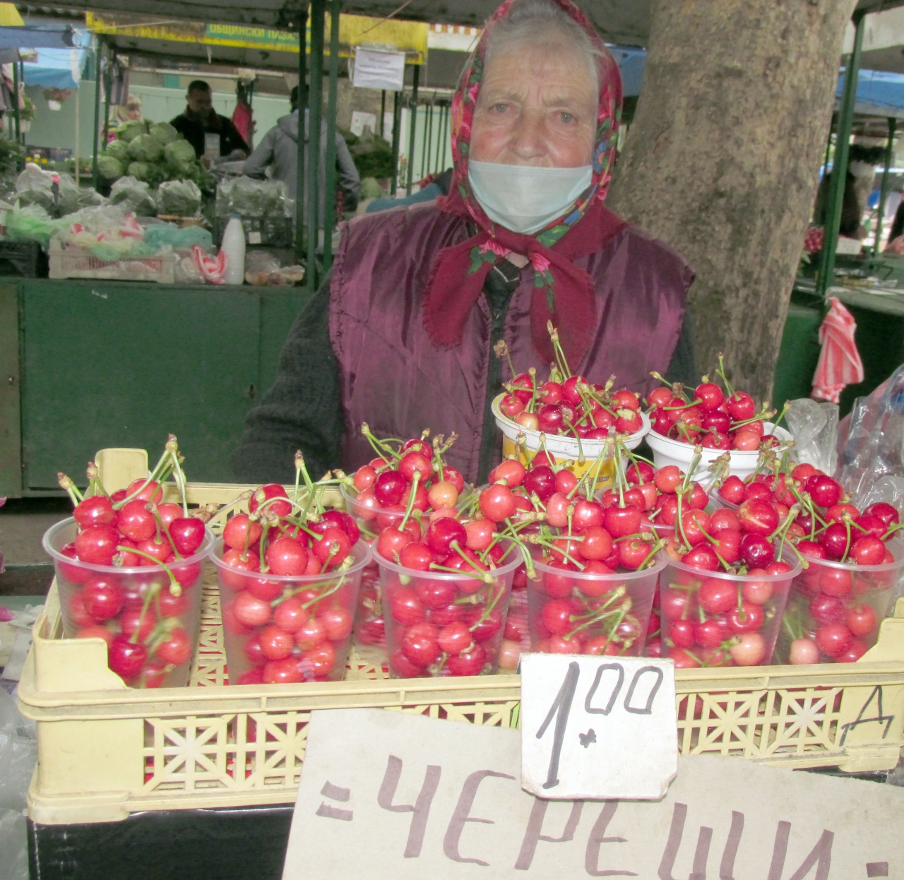 Черешите се продават в пластмасови чашки за безалкохолни напитки по 1 лев за чашка плодове.