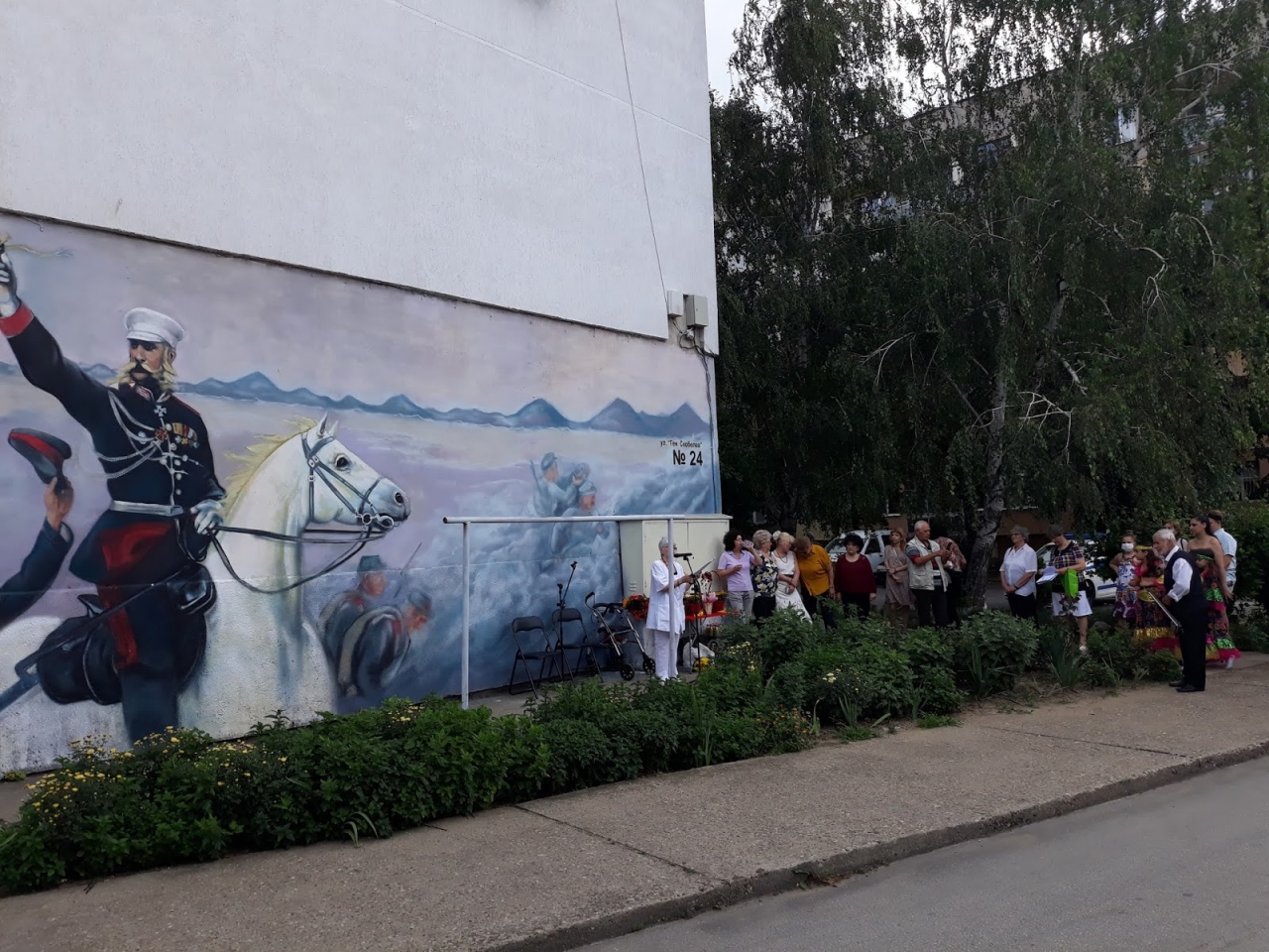 Въпреки валялия с прекъсване дъжд в град Силистра, днес в късния съботен следобед Инициативен комитет от живеещи на ул. "Генерал Скобелев" номер 24 откри осъществената идея, замислена през м. ноември м.г., както обяви председателката на сдружението Лилия Велчева, а именно - източната фасада на жилищния блок да бъде изобразена с лика на генерал Михаил Скобелев (Белия генерал). Пред него и от двете страни на блока също негови жители поддържат красиви градинки със специално създаден алпинеум.